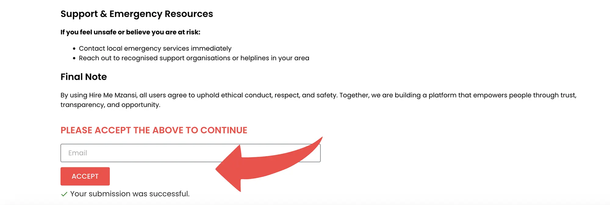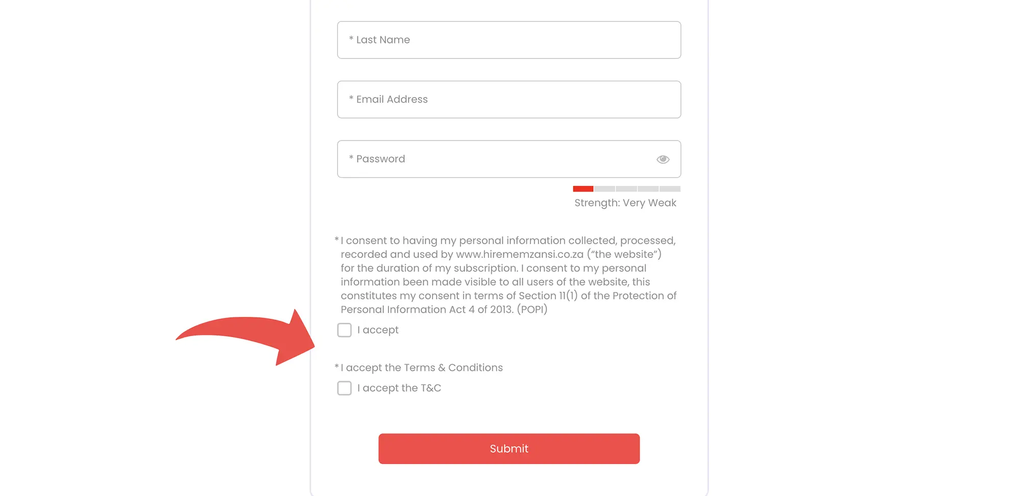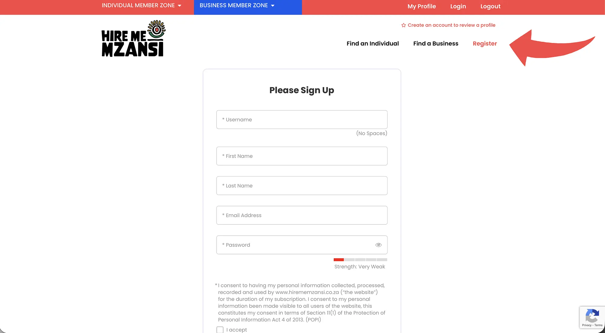Select register and complete the sign up form on www.hirememzansi.co.za, and accept the POPI consent and Terms and conditions and click submit. See example below.